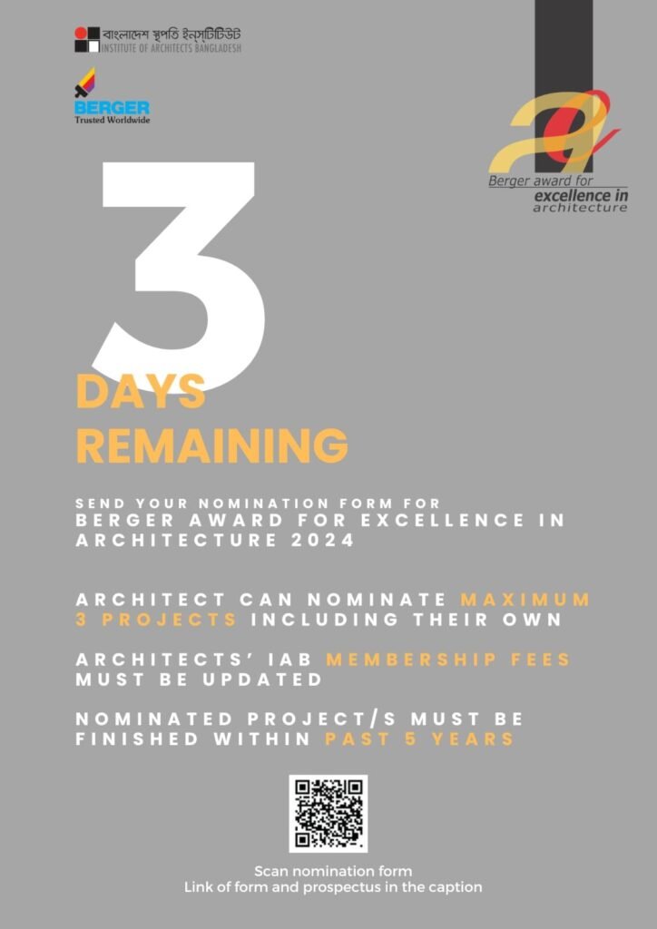 Berger Award for excellence in Architecture, 2024 এর প্রথম ধাপ, নমিনেশন ফর্ম পূরণ করার জন্য আর মাত্র ৩ দিন বাকি আছে। নমিনেশন প্রাপ্ত প্রজেক্ট জমা দেওয়ার শেষ তারিখ ২৫ জুলাই, ২০২৪। বিস্তারিত জানতে প্রস্পেক্টাস দেখুন।