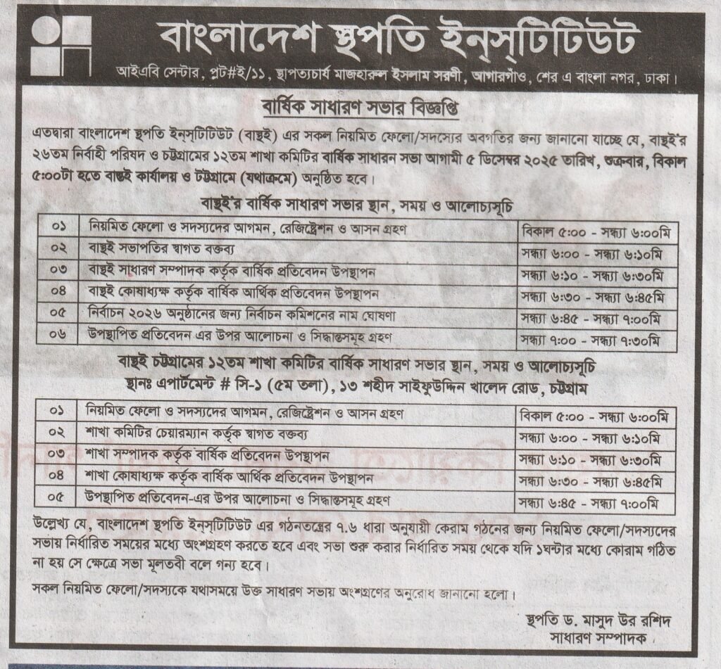 General Meetings এতদ্বারা বাংলাদেশ স্থপতি ইন্স্টিটিউট (বাস্থই) এর সকল নিয়মিত ফেলো/সদস্যের অবগতির জন্য জানানো যাচ্ছে যে, বাস্থই’র ২৬তম নির্বাহী পরিষদ ও চট্টগ্রাম ১২তম শাখা কমিটির বার্ষিক সাধারণ সভা আগামী ৫ […]
