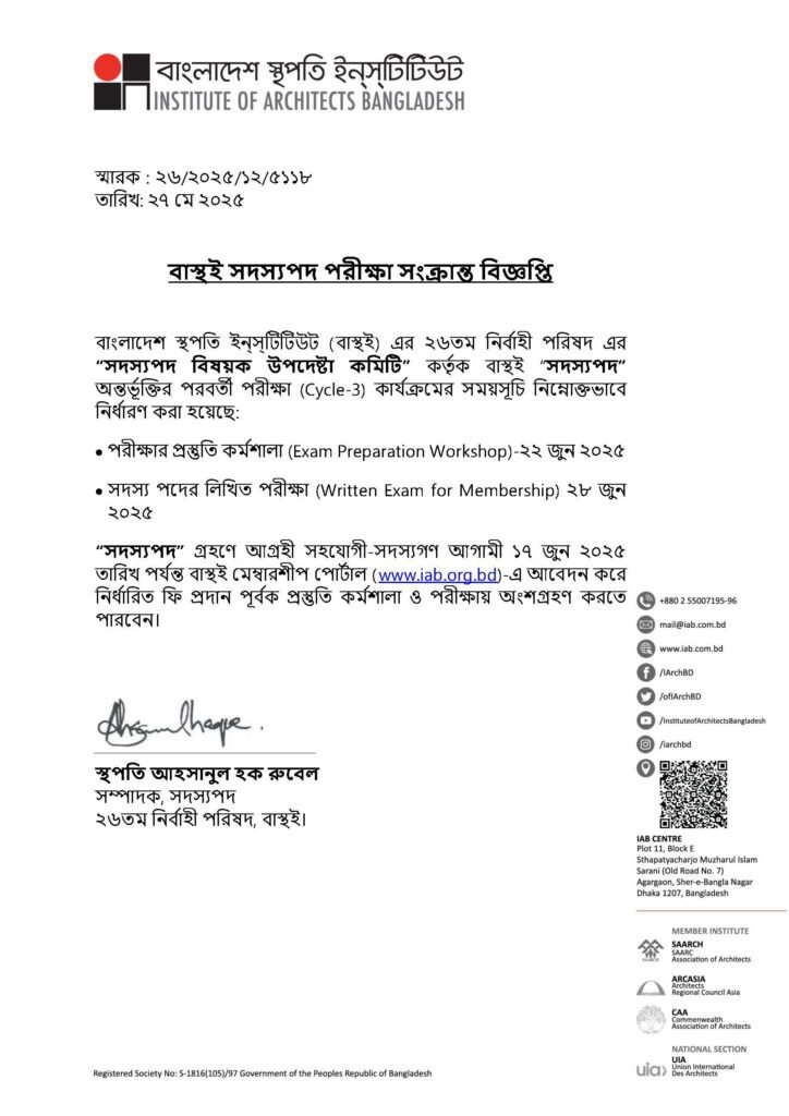 বাংলাদেশ স্থপতি ইন্স্টিটিউট (বাস্থই) এর ২৬তম নির্বাহী পরিষদ এর “সদস্যপদ বিষয়ক উপদেষ্টা কমিটি” কর্তৃক বাস্থই “সদস্যপদ” অন্তর্ভূক্তির পরবর্তী পরীক্ষা (Cycle-4) কার্যক্রমের সময়সূচি নিম্নোক্তভাবে নির্ধারণ করা হয়েছে: পরীক্ষার প্রস্তুতি কর্মশালা (Exam […]