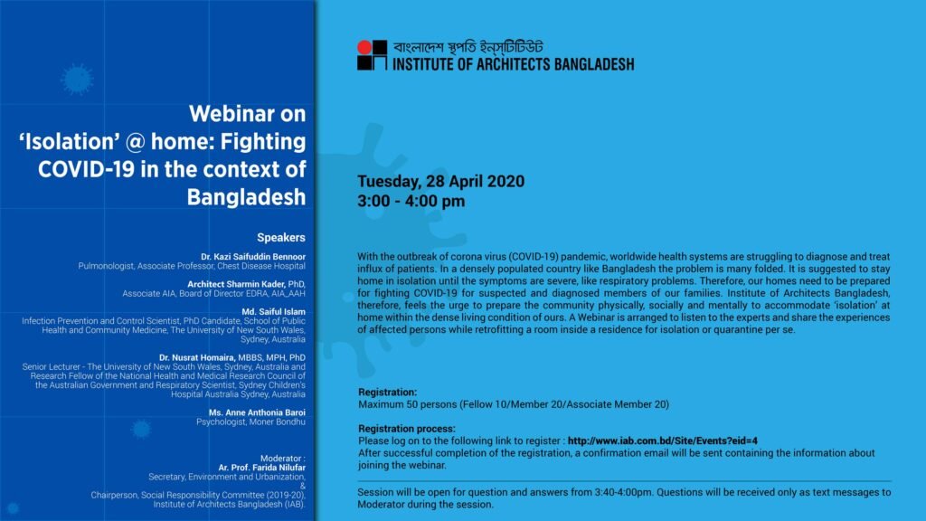 Social Events Schedule: 26-Apr-2020 08:30 PM to 28-Apr-2020 12:00 PM Venue: Zoom Meeting (Media) Webinar on: ‘Isolation’ @ home: Fighting COVID-19 in the context of Bangladesh Date and Time: 3:00 – 4:00