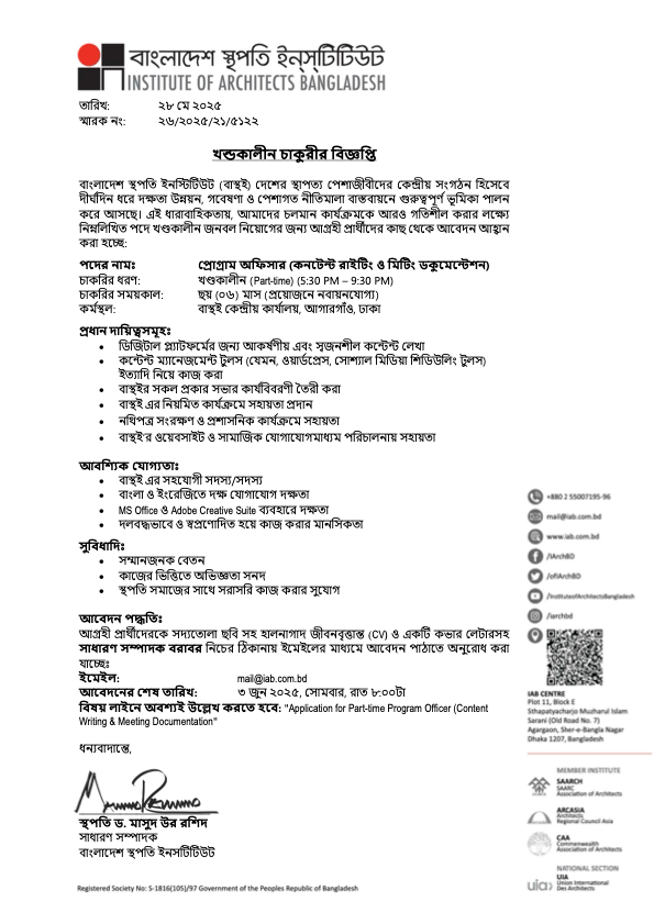 বাংলাদেশ স্থপতি ইনস্টিটিউট (বাস্থই) দেশের স্থপতিদের কেন্দ্রীয় সংগঠন হিসেবে দীর্ঘদিন ধরে স্থাপত্য উন্নয়ন, গবেষণা ও পেশাগত নীতিমালা বাস্তবায়নে গুরুত্বপূর্ণ ভূমিকা পালন করে আসছে। এই ধারাবাহিকতায়, আমাদের চলমান কার্যক্রমকে আরও গতিশীল করার লক্ষ্যে নিম্নলিখিত পদে খণ্ডকালীন জনবল নিয়োগের জন্য আগ্রহী প্রার্থীদের নিকট থেকে আবেদন আহ্বান করা হচ্ছে: